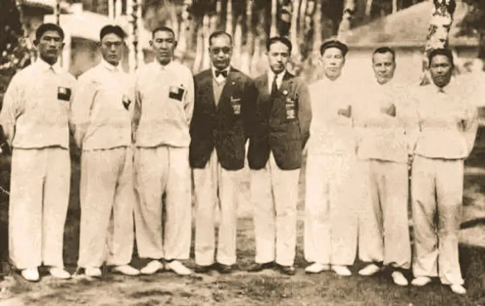 柏林奥运会,中国代表团国术队6名男队员与领队 (图片源自网络)